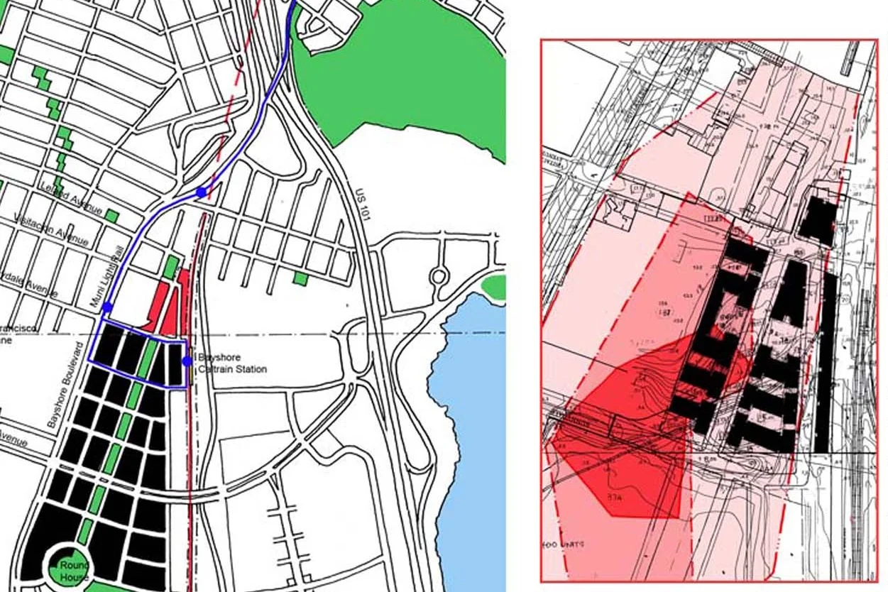 Located just north of the San Francisco / Brisbane city line, the project site is adjacent to the planned Bayshore inter-modal station that will combine CalTrain commuter rail and San Francisco Municipal Railway light rail services. The proposed development of approximately 450-500 unit residential neighborhood involves extensive on-site environmental remediation of the existing industrial parcels.